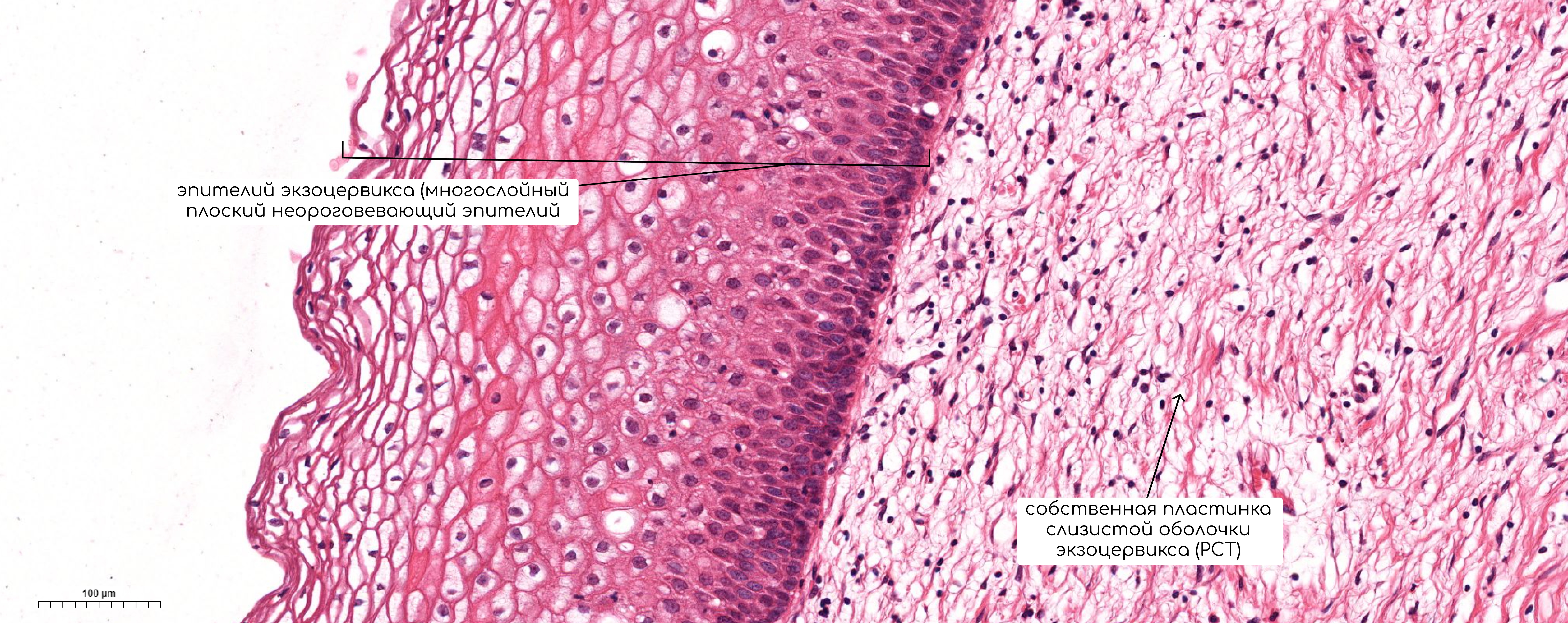 Слизистая оболочка влагалищной поверхности шейки матки называется экзоцервиксом, она покрыта многослойным плоским неороговевающим эпителием