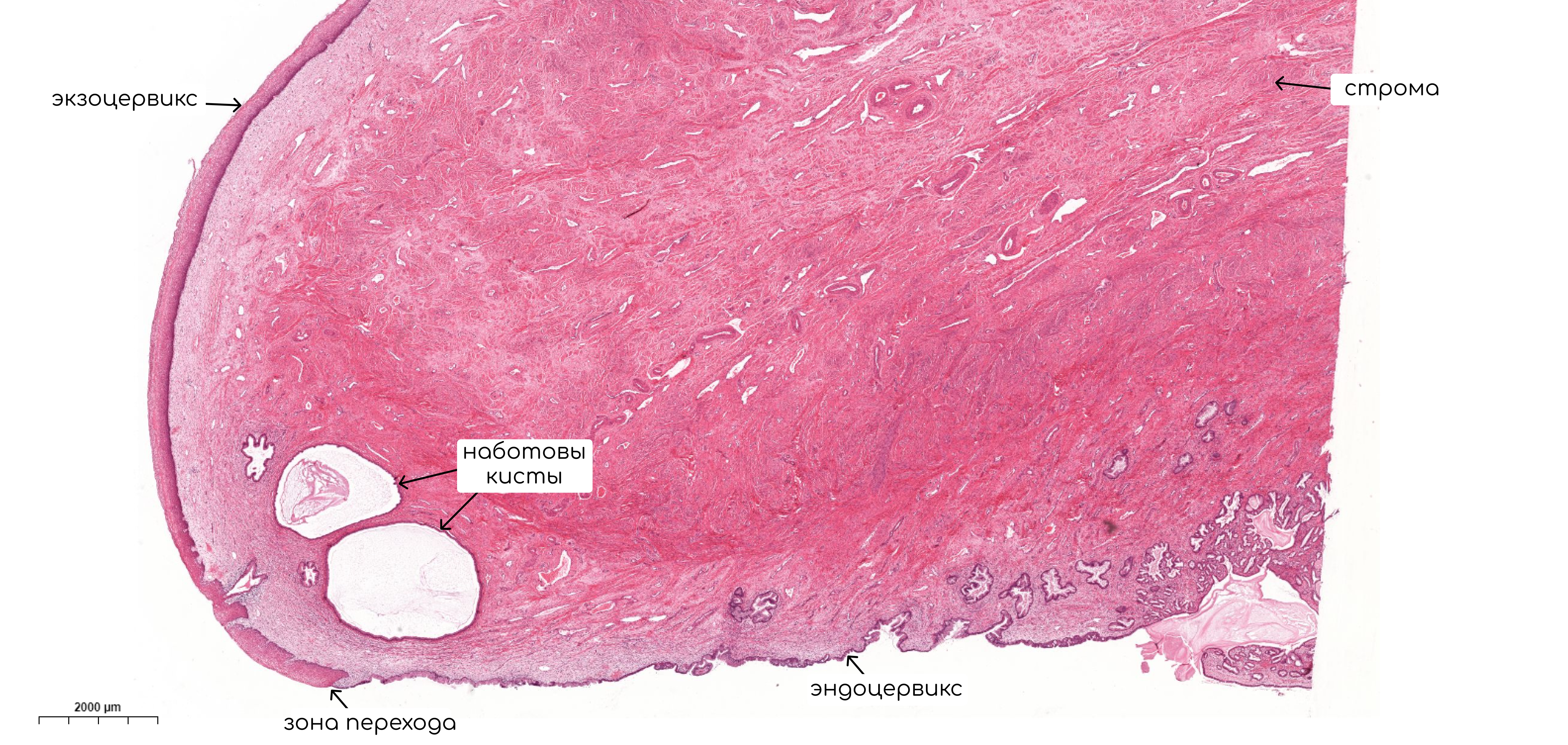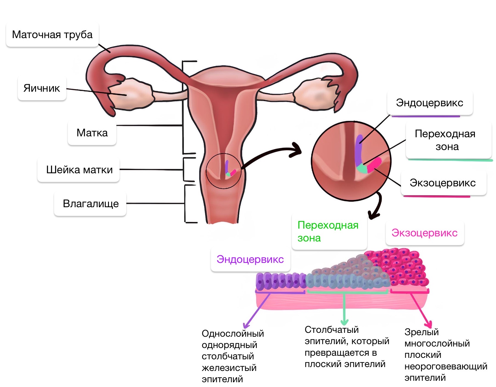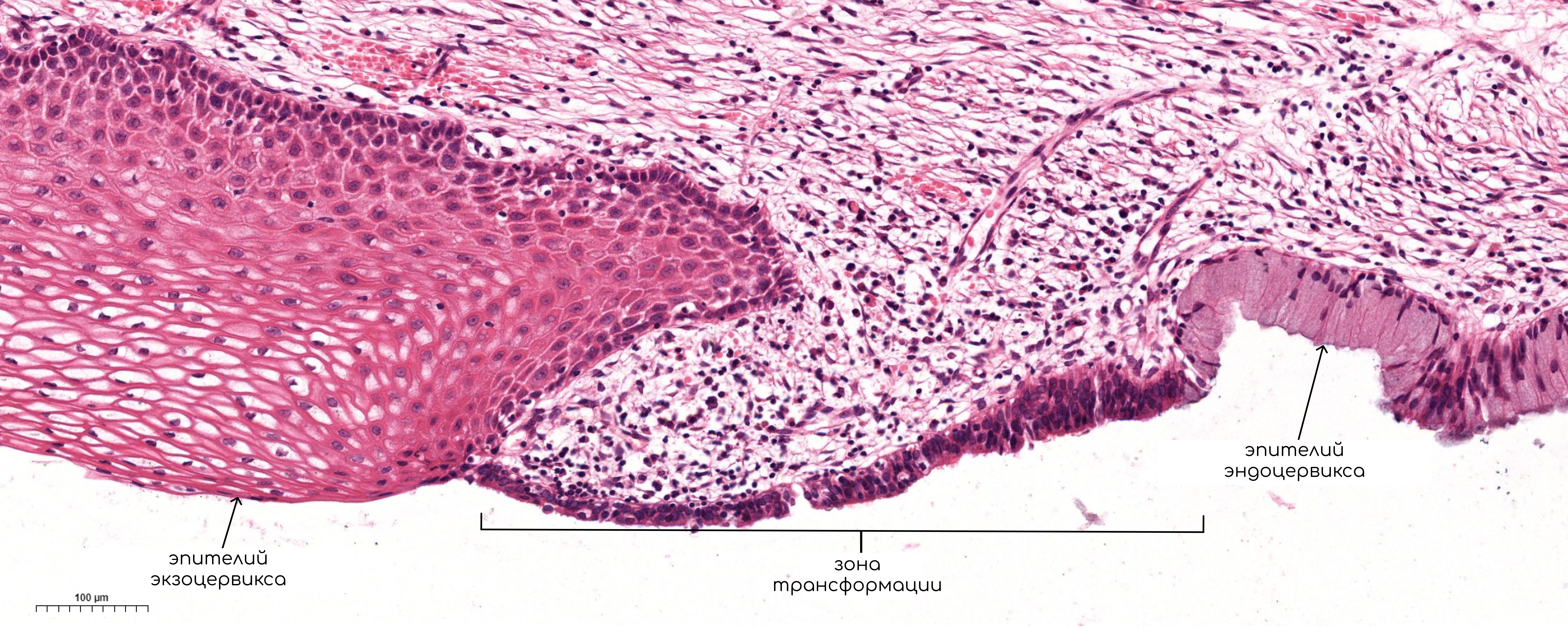 Место перехода эндоцервикса в экзоцервикс довольно резкое, находится у наружного зева (это точка, в которой цервикальный канал открывается во влагалище) и называется зоной трансформации