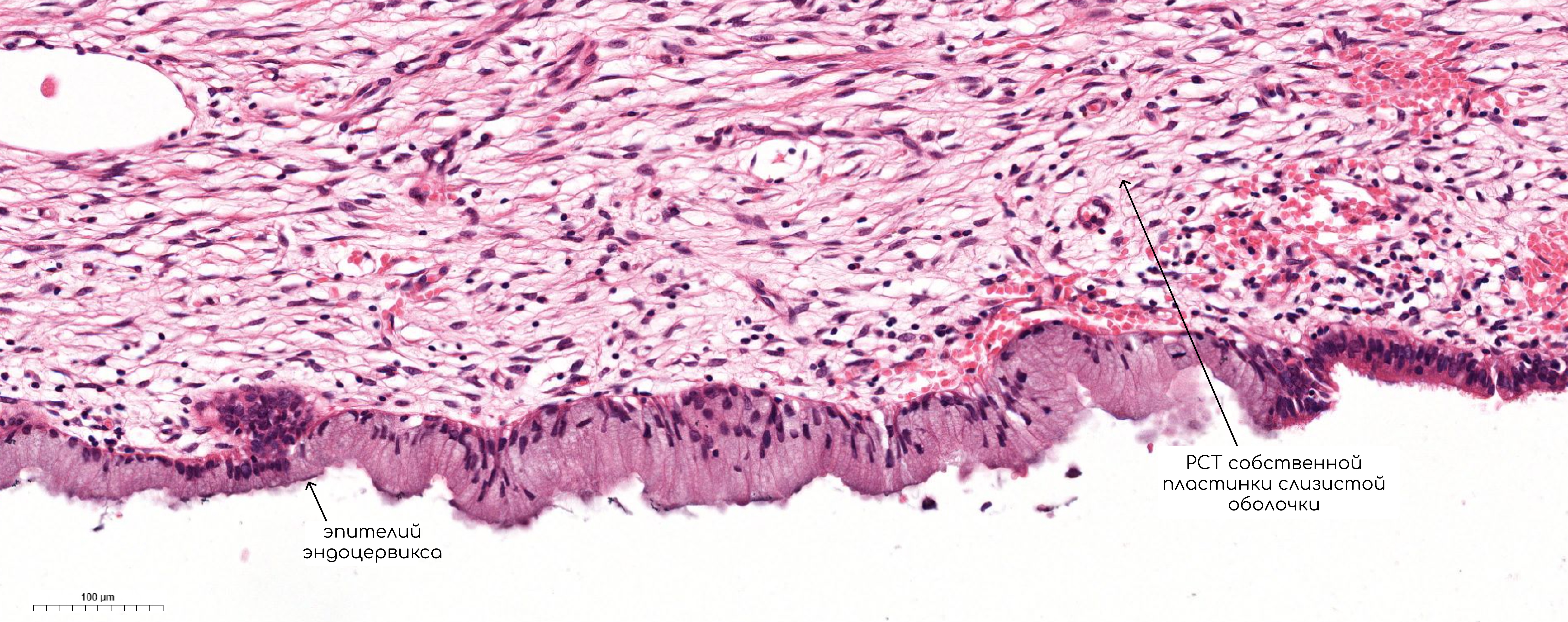 Слизистая оболочка цервикального канала называется эндоцервиксом, она покрыта однослойным однорядным столбчатым железистым эпителием