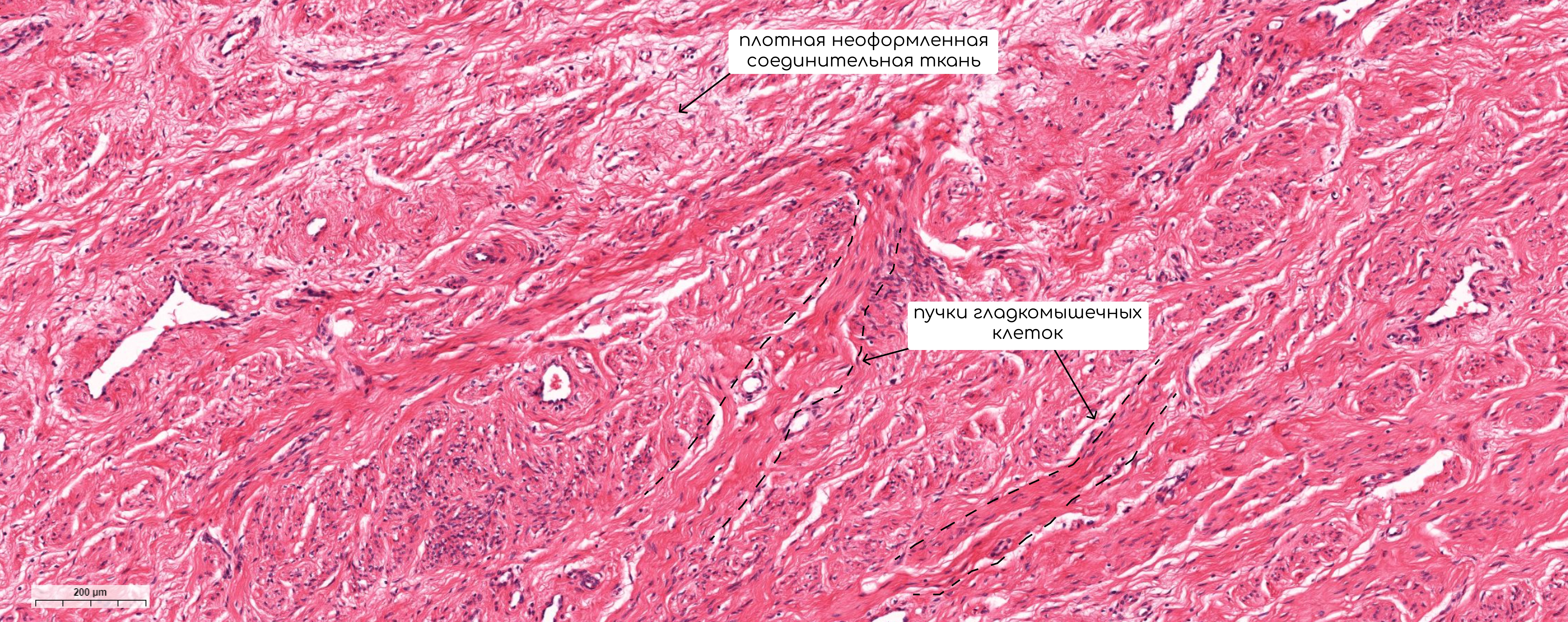 По данным зарубежной литературы под слизистой оболочкой располагается плотная неоформленная соединительная ткань, содержащая большое количество коллагеновых и эластических волокон, а также небольшое количество гладкомышечных клеток
