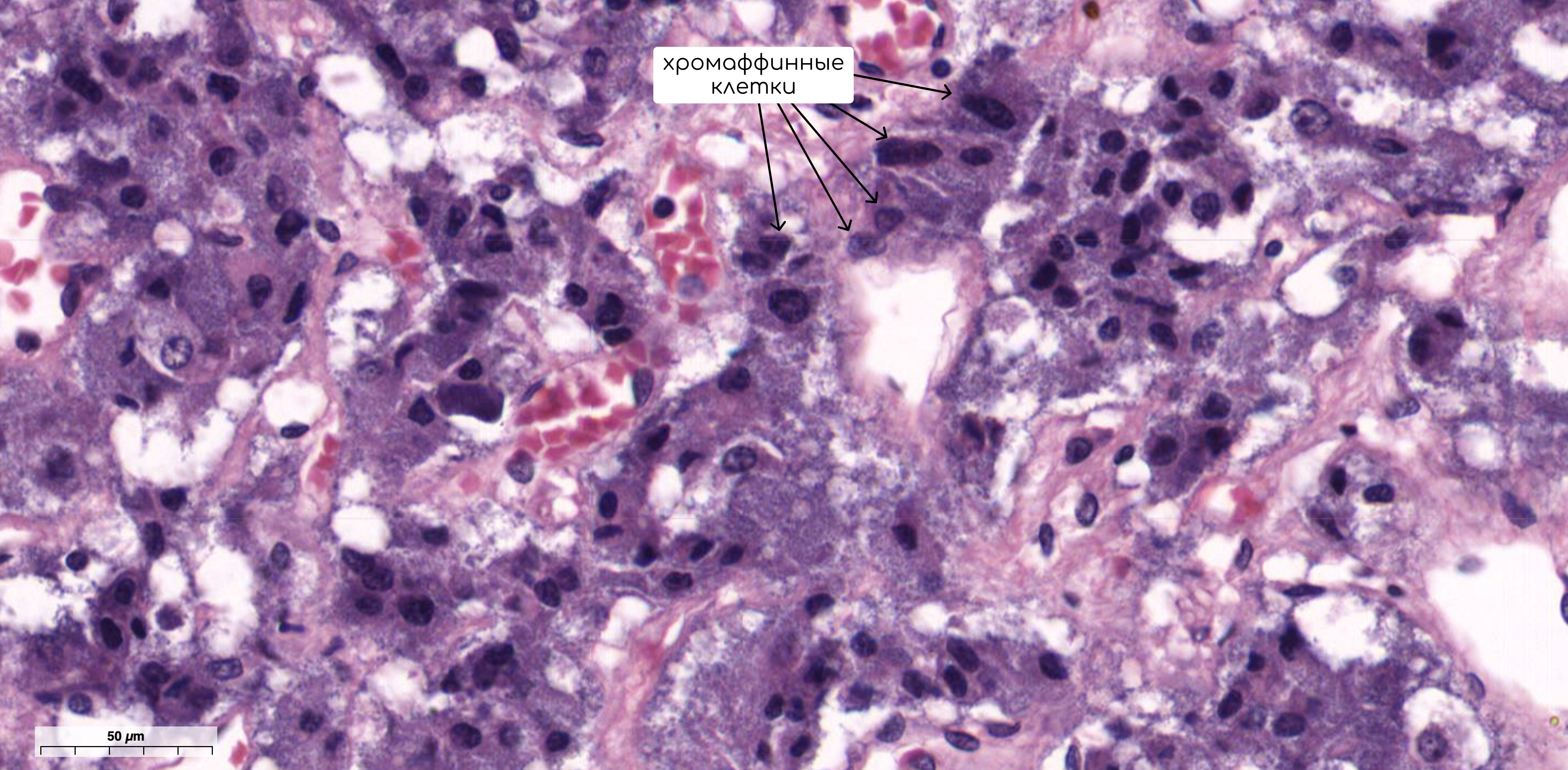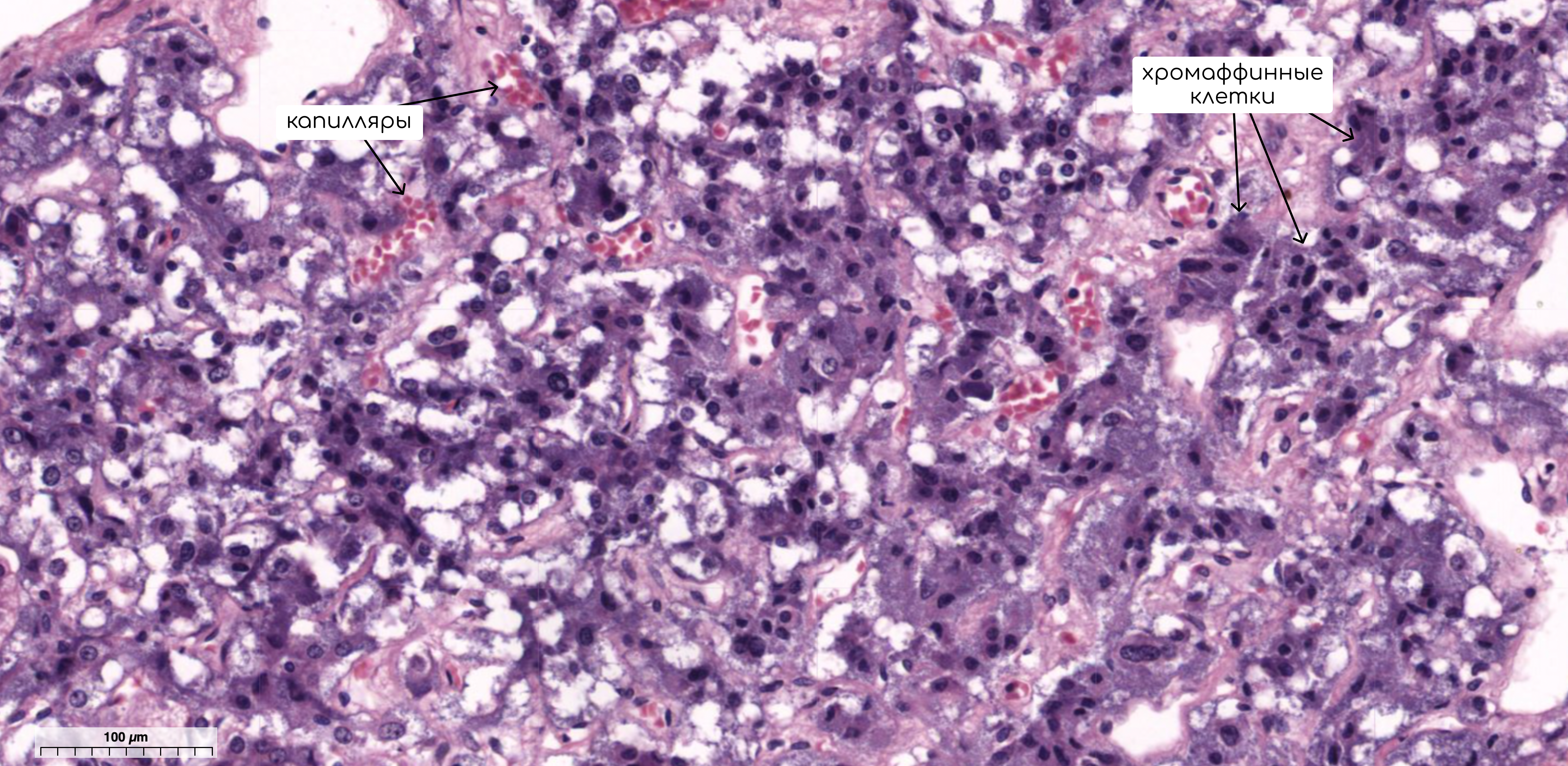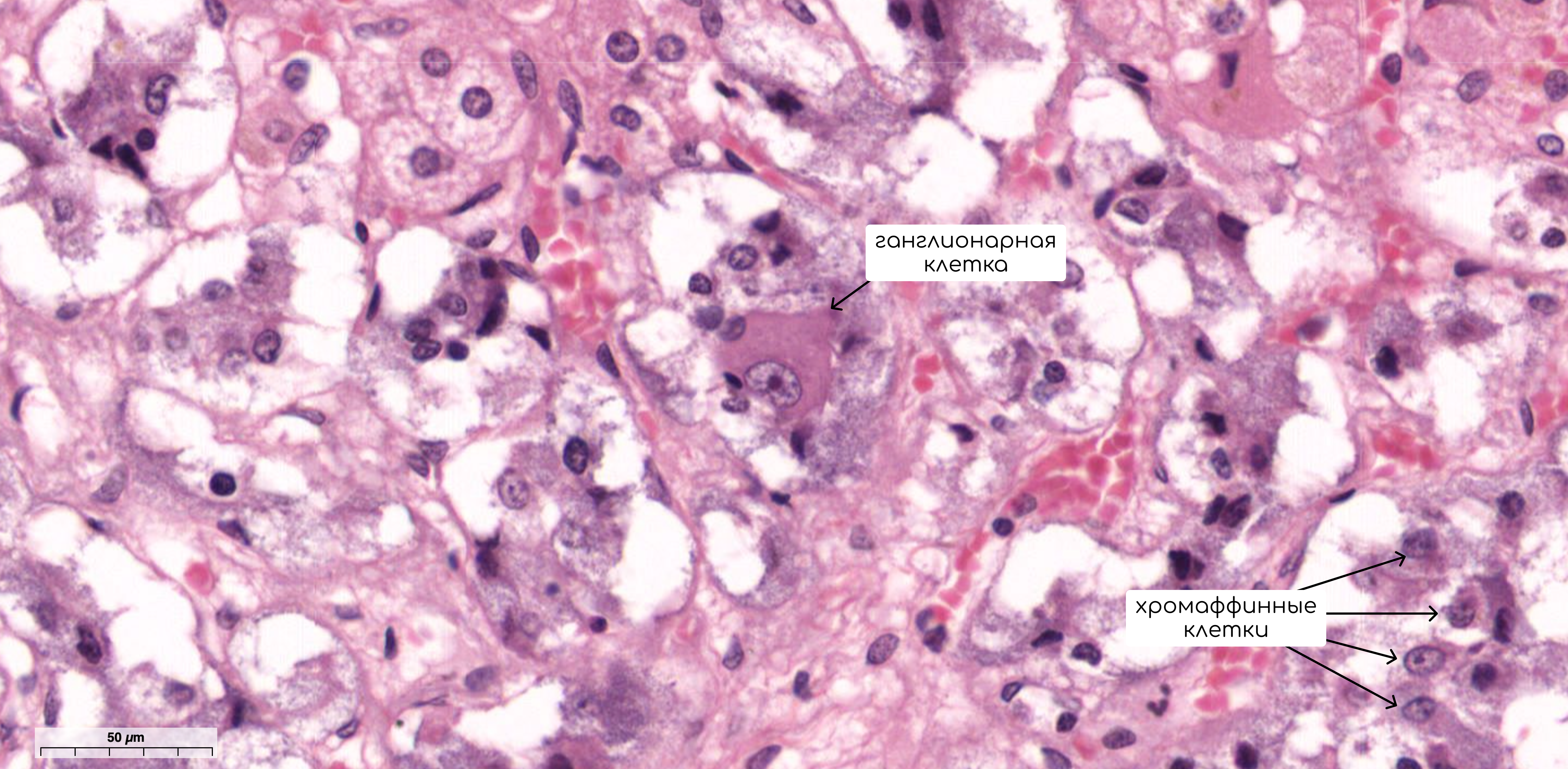 Иногда среди клеток мозгового вещества надпочечников встречаются ганглионарные клетки симпатического нервного узла. Между скоплениями клеток располагается прослойка из рыхлой соединительной ткани.