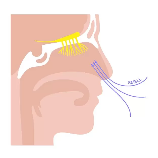 - Аксоны объединяются в обонятельные нити, которые выходят через решётчатую пластинку решётчатой кости и заканчиваются в обонятельной луковице мозга, где образуют синапсы с митральными и тафтинговыми клетками