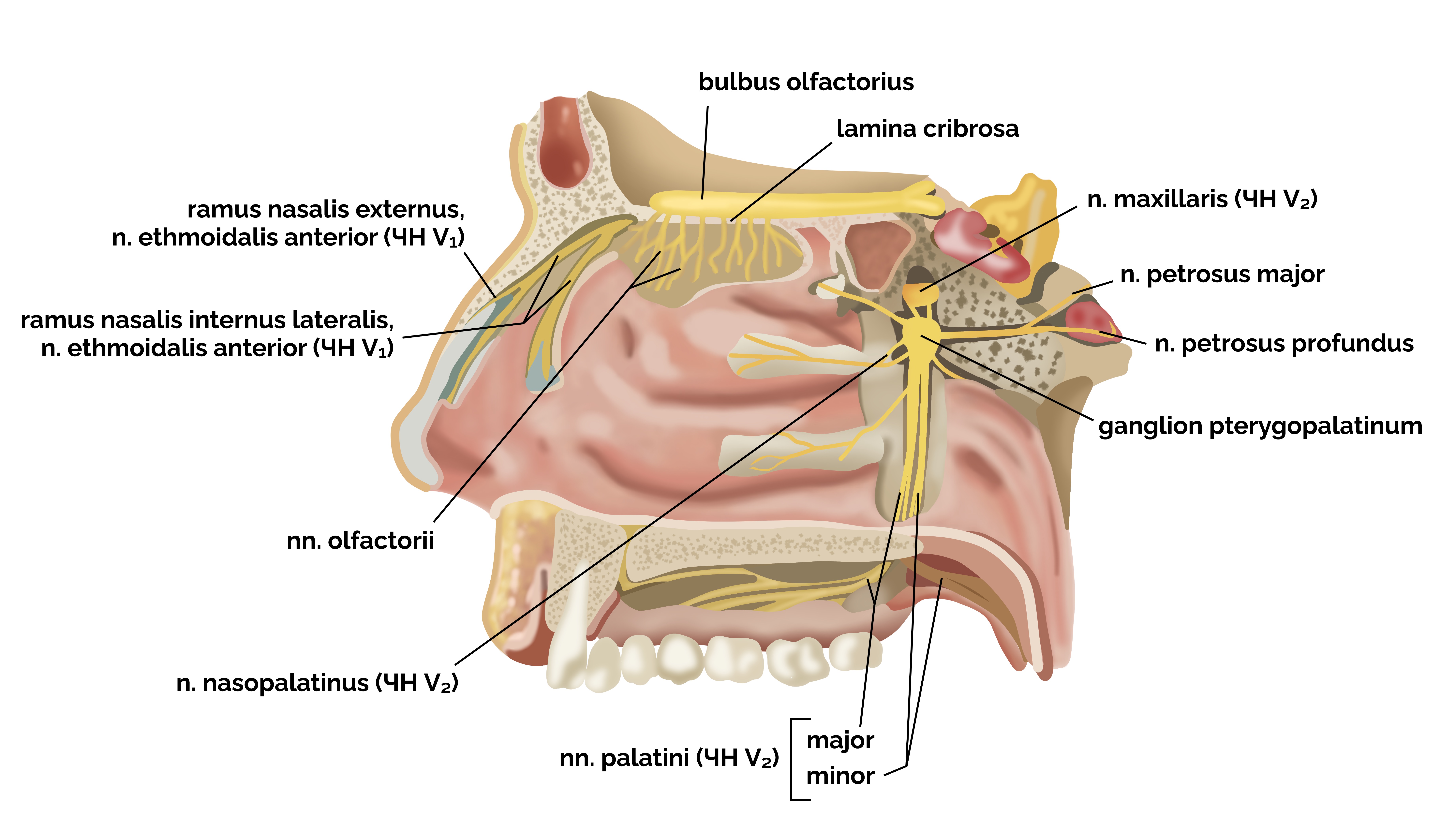 - Кровеносные и лимфатические сосуды; кровеносные сосуды образуют богатую и разветвлённую сеть, благодаря которой воздух согревается в полости носа