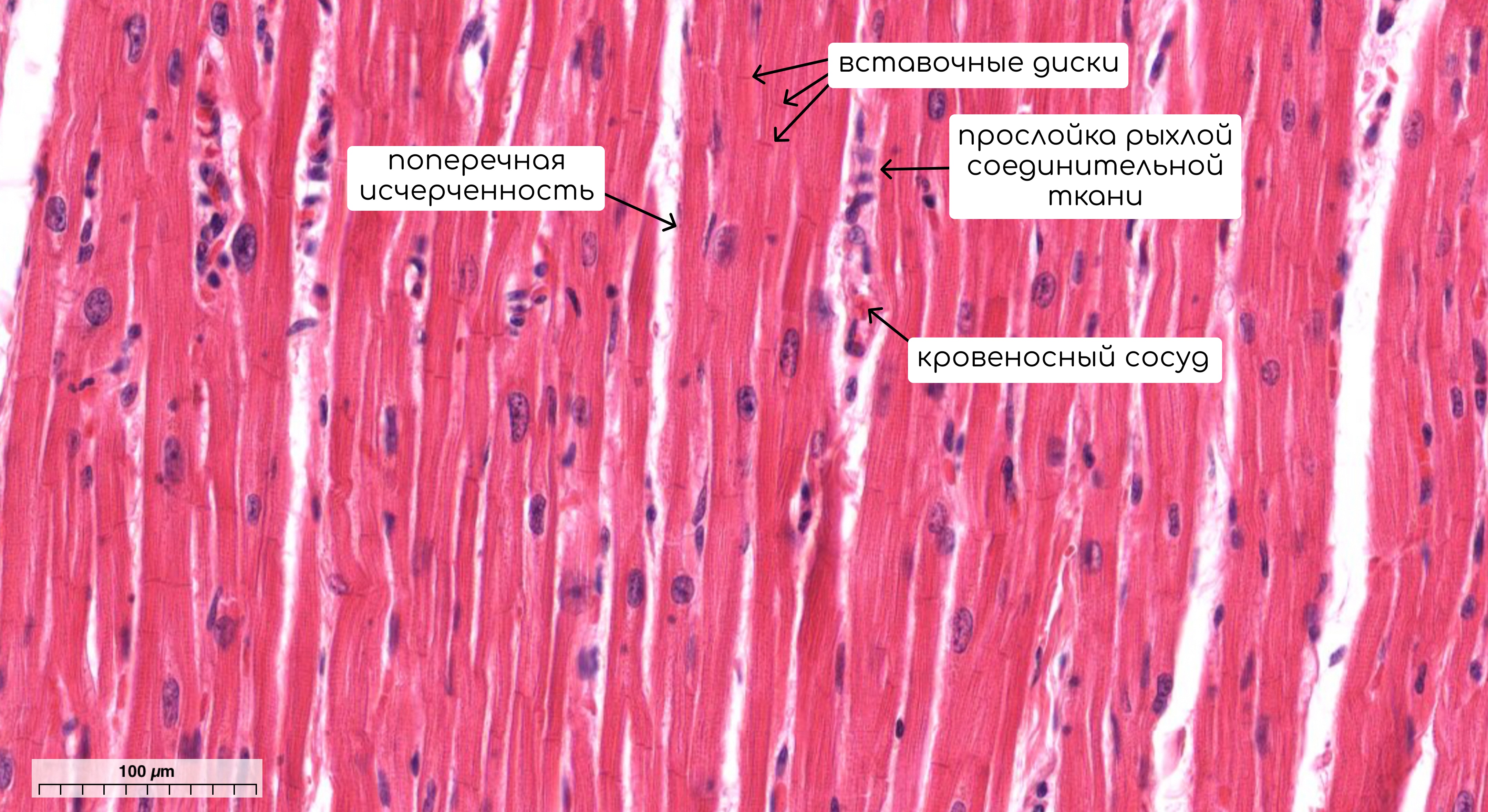 Кардиомиоциты в продольном разрезе. Ядра овальной формы, находятся в центральной части клетки. В цитоплазме определяется поперечная исчерченность. Между клетками вставочные диски.